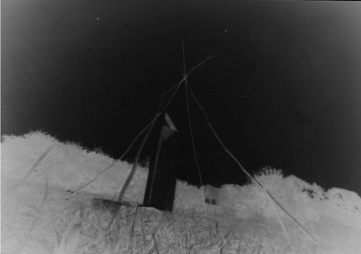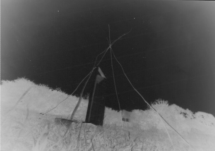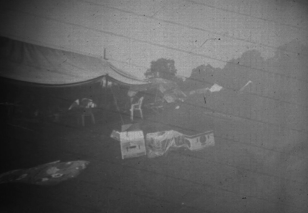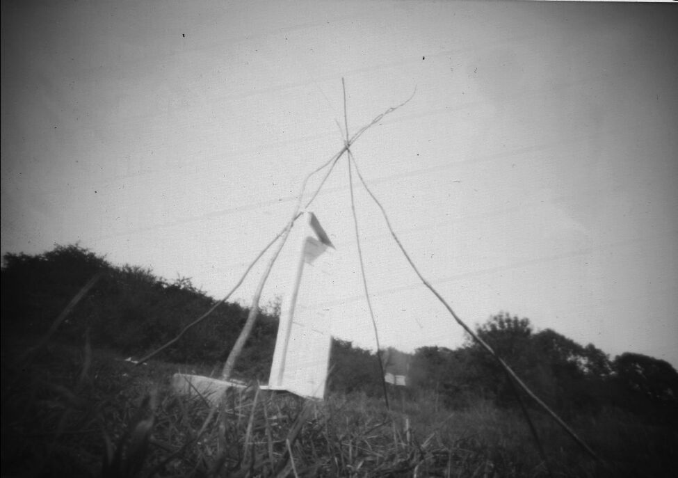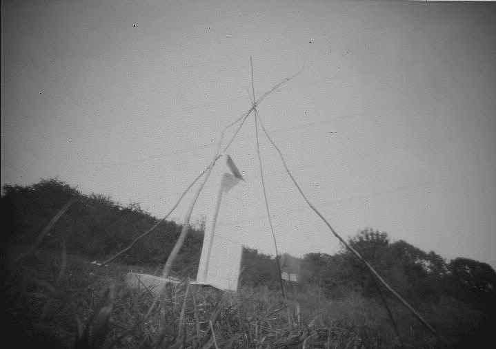 At Passages Summer 2003 there was a series of sessions in using pinhole photography (using old biscuit tins, etc with pinholes, ordinary black and white photographic paper, and a small darkroom in a bender).
